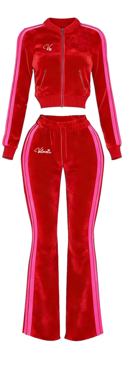 Bold, confident, and impossible to ignore. The ruby red velvet flare bottoms are designed to sculpt and elongate your silhouette while delivering rich color and shine. The luxe velvet fabric feels smooth against the skin, while the flared leg and contrast side stripes add a sporty-chic edge. A statement set for girls who love being seen.
